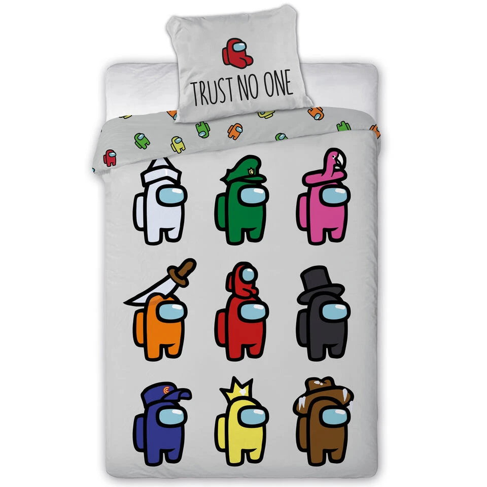 Among Us Dekbedovertrek, Trust No One. Grappig katoenen dekbedovertrek van Among Us, het online computerspel. Kan jij zien wie de crewmate is of de imposter? Een kleurrijke aanvulling voor elke slaapkamer en gamefanaat. Het overtrek is dubbelzijdig bedrukt en wordt met een extra groot kussensloop geleverd, waardoor het een echte blikvanger wordt. Ook leuk om cadeau te geven voor een verjaardag of de feestdagen.Â