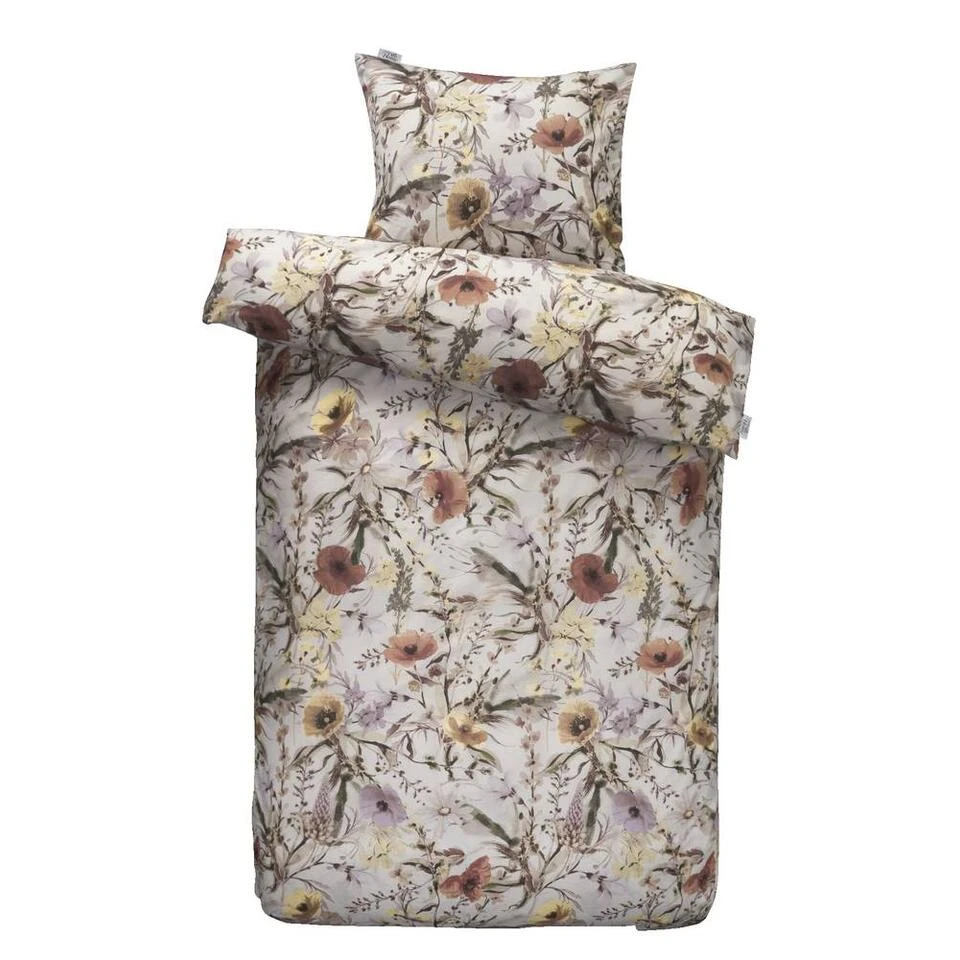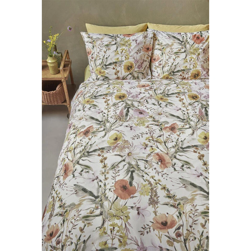 Een goed begin van de dag; wakker worden onder het dekbedovertrek Pretty Foral van Ariadne at Home. Het overtrek heeft een zomerse print van aquarelgeschilderde bloemen in verschillende kleuren. Zachte nude tinten, lila, oker, groentinten en terra geven het boeket kleur. Tegen de gebroken witte ondergrond komen de bloemen prachtig tot hun recht. Zowel de voor- als achterzijde van het overtrek zijn hetzelfde.