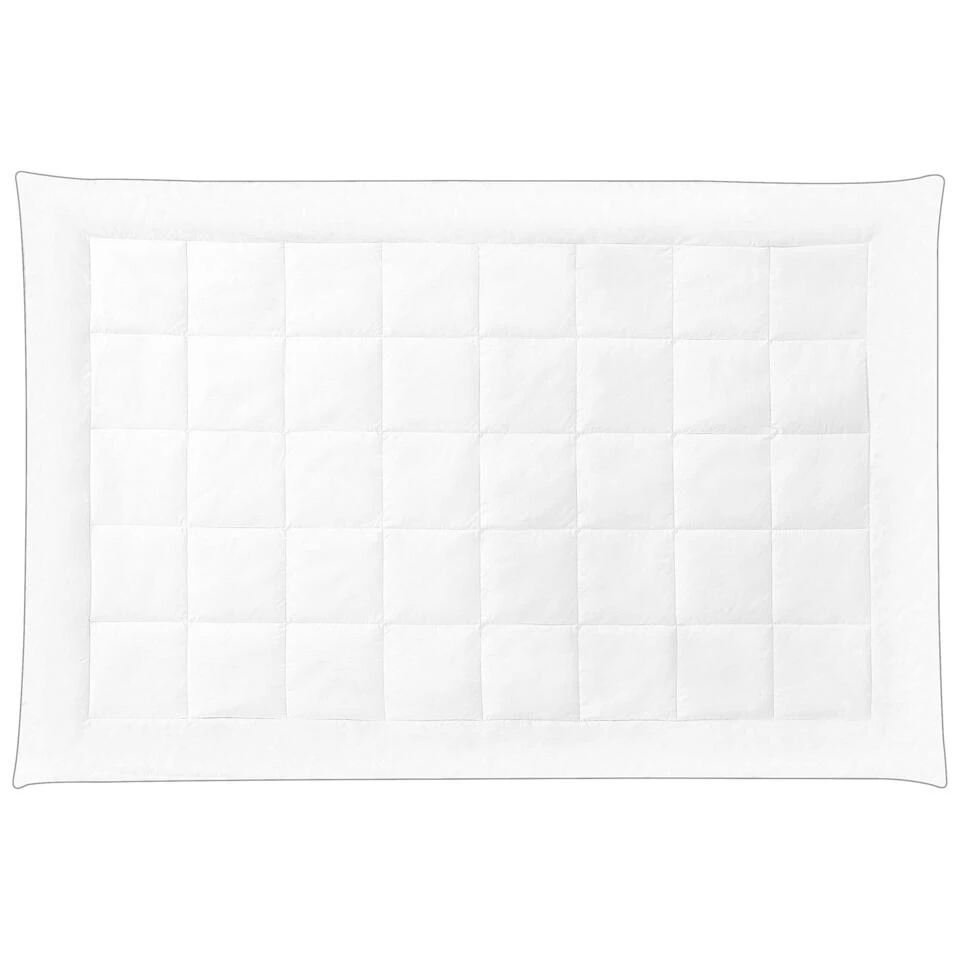 Wit dekbed van huid-vriendelijk Japara katoen met grijze rand. Dit dekbed is bijzonder temperatuur regulerend en heeft uitstekende hygiënische en isolerende eigenschappen. Dankzij de extreem lichte vulling ligt het model bijzonder zacht op de huid. Daarnaast heeft de deken een slijtvaste, onderhoudsvriendelijke hoes van zijdezacht Japara-katoen. Het grote geruite quiltwerk zorgt voor volume en beperkt verschuiven van de dekbedvulling en zorgt zo voor een gelijkmatige warmteverdeling. Het lichtgewicht dekbed is omzoomd met smalle, grijze satijnen bies die het textiel visueel upgrade.