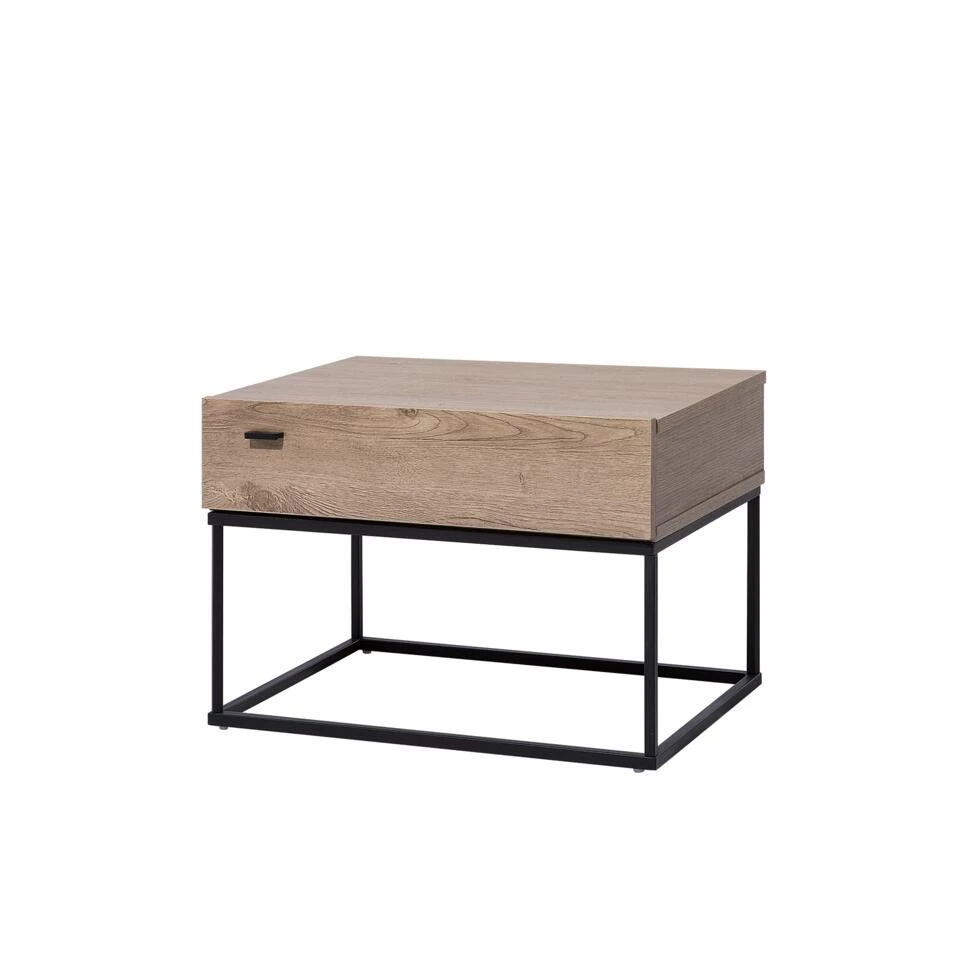Decoratief nachtkastje in industriële stijl. Jouw nachtkastje kan zoveel meer zijn dan een opbergruimte voor een wekker, boeken en een bedlamp! Het model rust op een stevig frame van gepoedercoat metaal in het zwart. De lade met een smal handvat van zwart metaal biedt extra opbergruimte. Dankzij de combinatie van verschillende materialen past dit nachtkastje goed bij zowel moderne, rustieke als industriële stijlen. Een nachtkastje met een onderscheidend karakter!