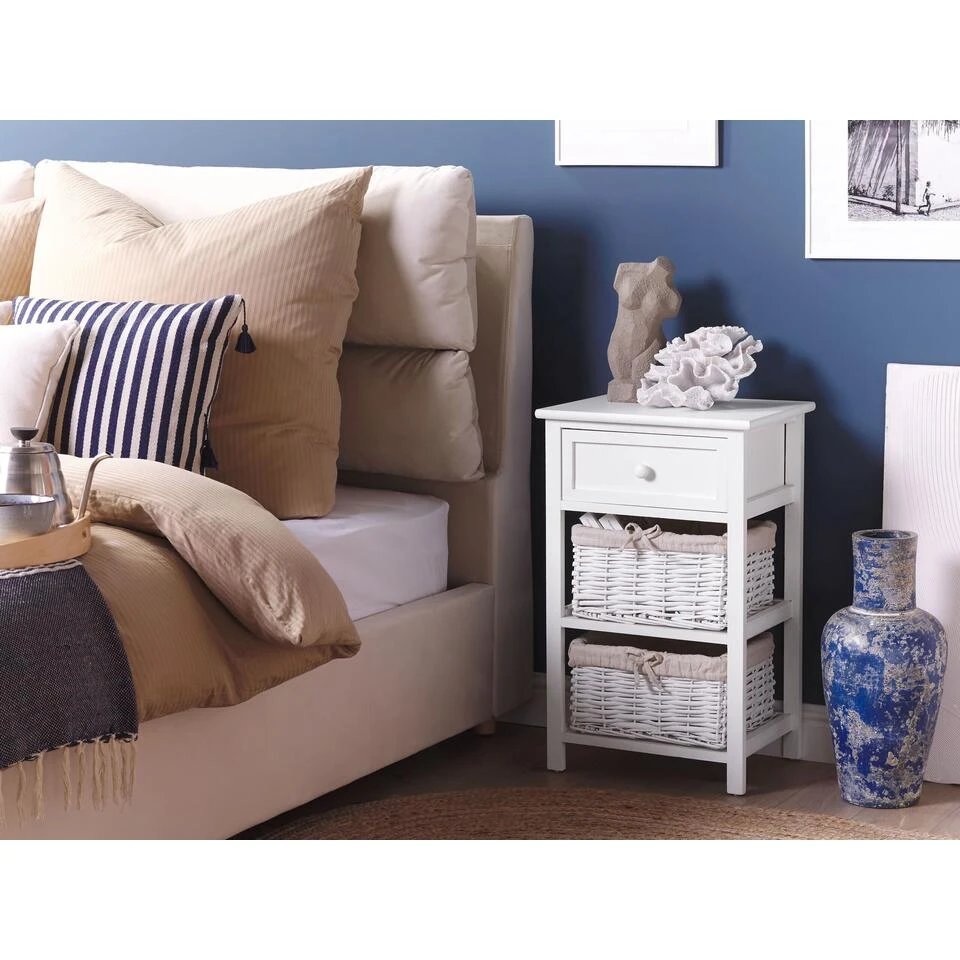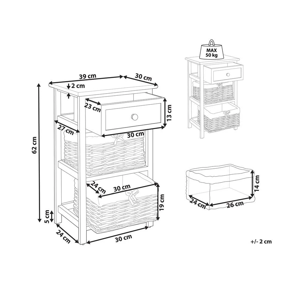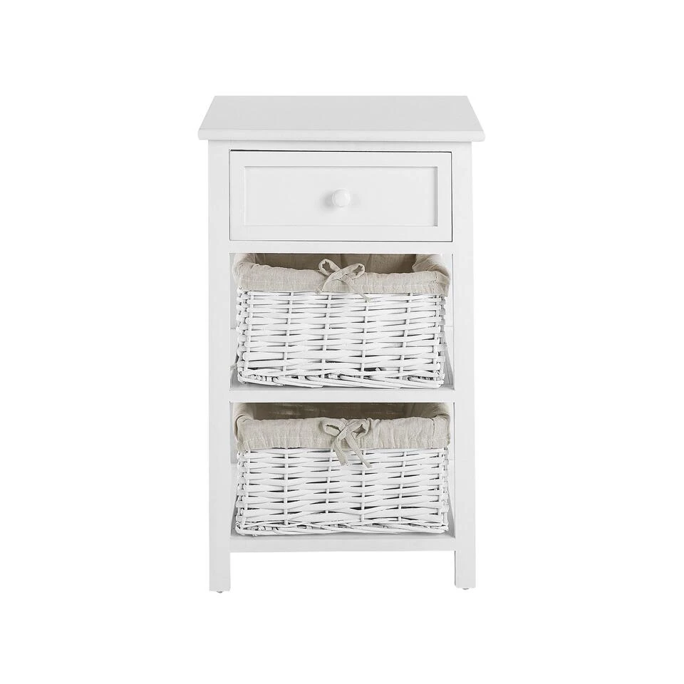 Nachtkastje met mandjes. Organiseer je slaapkamer met dit functionele en stijlvolle nachtkastje voor naast je bed. Dit kastje heeft meer dan genoeg ruimte voor opslag dankzij zijn lades en zijn mandjes. De mandjes hebben binnenin een heerlijke zachte beige stof die lang mee gaat. Met wat accessoires en decoraties erop is dit nachtkastje een prachtige aanvulling voor je interieur.