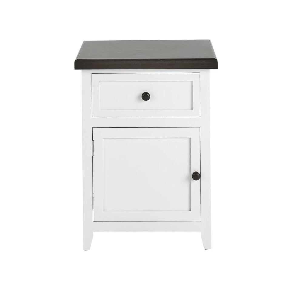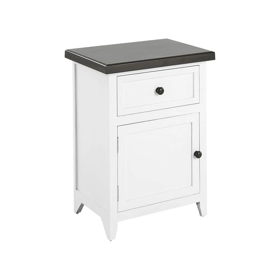 Traditioneel Nachtkastje. Dit nachtkastje is een stijlvolle aanvulling voor alle slaapkamers. Het kastje heeft een ruime lade waar je van alles in kan bewaren en een compartiment waar je je favoriete boeken kan opslaan. Het witte kastje en het contrast van de bruine bovenkant, samen met zijn combinatie van rechte lijnen maken dat dit kastje perfect te combineren is met verschillende interieur stijlen.