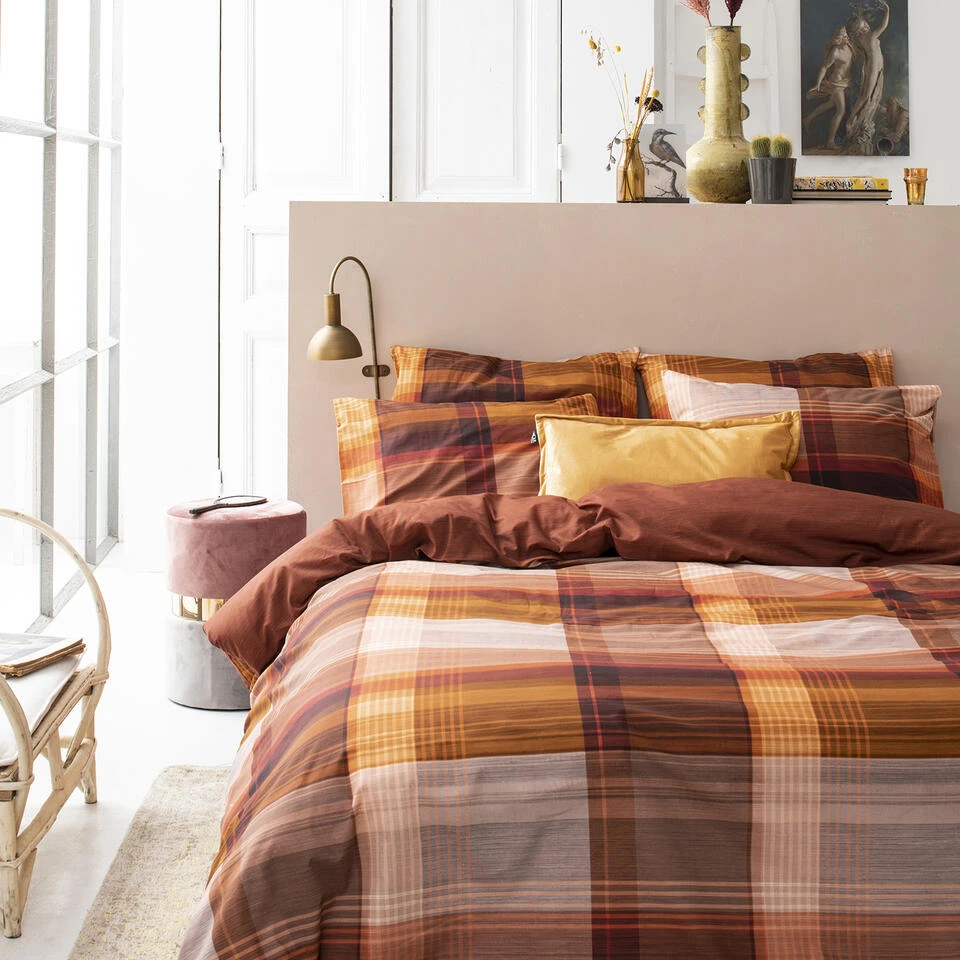 Het Ponte dekbedovertrek van Cinderella heeft een tijdloze ruitenprint uitgevoerd in warme kleuren, van aarderood tot okergeel waarmee je warmte en gezelligheid creëert in de slaapkamer. Het overtrek heeft een double-face ontwerp met op de achterzijde een effen print met een subtiel effect van een ribstructuur.