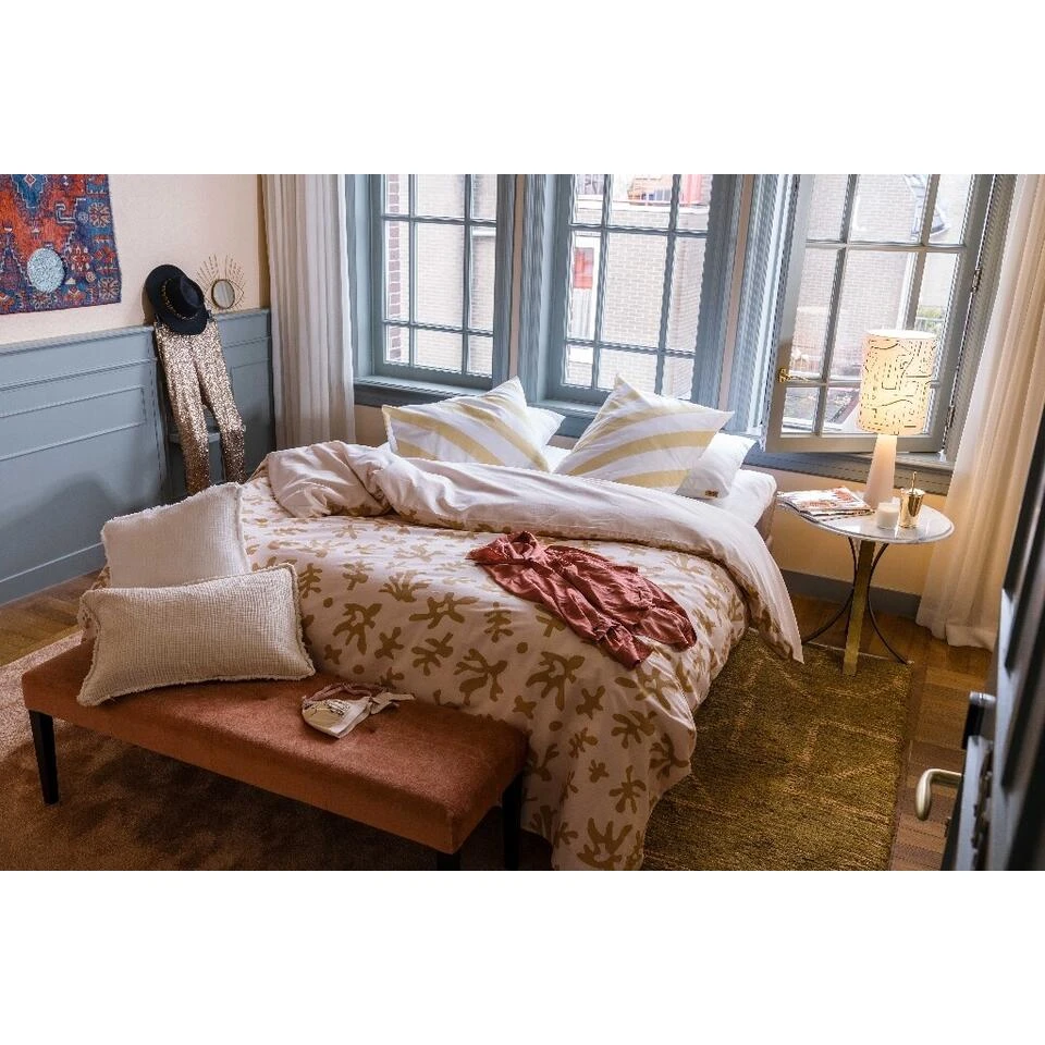 De kussensloopjes hebben een diagonale streep aan beide kanten in een nude kleur. De combinatie is unexpected maar dat maakt het alleen maar meer fashionable! En het Dindi labeltje rechtsonder is een daily reminder zodat jij weet; we’re always there for you! Doordat dit amazing overtrek is gemaakt van 70% gerecycled katoen, denk jij samen met ons aan het environment!