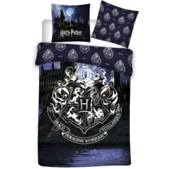 Harry Potter Dekbedovertrek, Logo. Een geweldig polyester dekbedovertrek van de bekende tovenaarsschool Zweinstein uit de Harry Potter films. Dit eenpersoons dekbed heeft een afbeelding van de Zweinstein-school en op de voorgrond het logo van de school. Zowel het dekbed als de kussensloop zijn tweezijdig bedrukt, wat meerdere mogelijkheden geeft voor het opmaken van het bed. Als echte Harry Potter-fan is dit een dekbedovertrek wat niet mag ontbreken in je slaapkamer! Een fantastisch cadeau idee voor een verjaardag of de feestdagen.