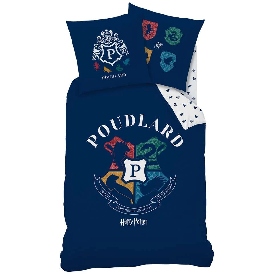 Harry Potter Dekbedovertrek, Poudlard. Prachtig dekbedovertrek met een mooi design van het logo van Zweinstein. Onder het logo pronkt trots de franse benaming van Hogeschool voor Hekserij en Hocus-Pocus:Â Poudlard. Leuk cadeau voor elke fan.