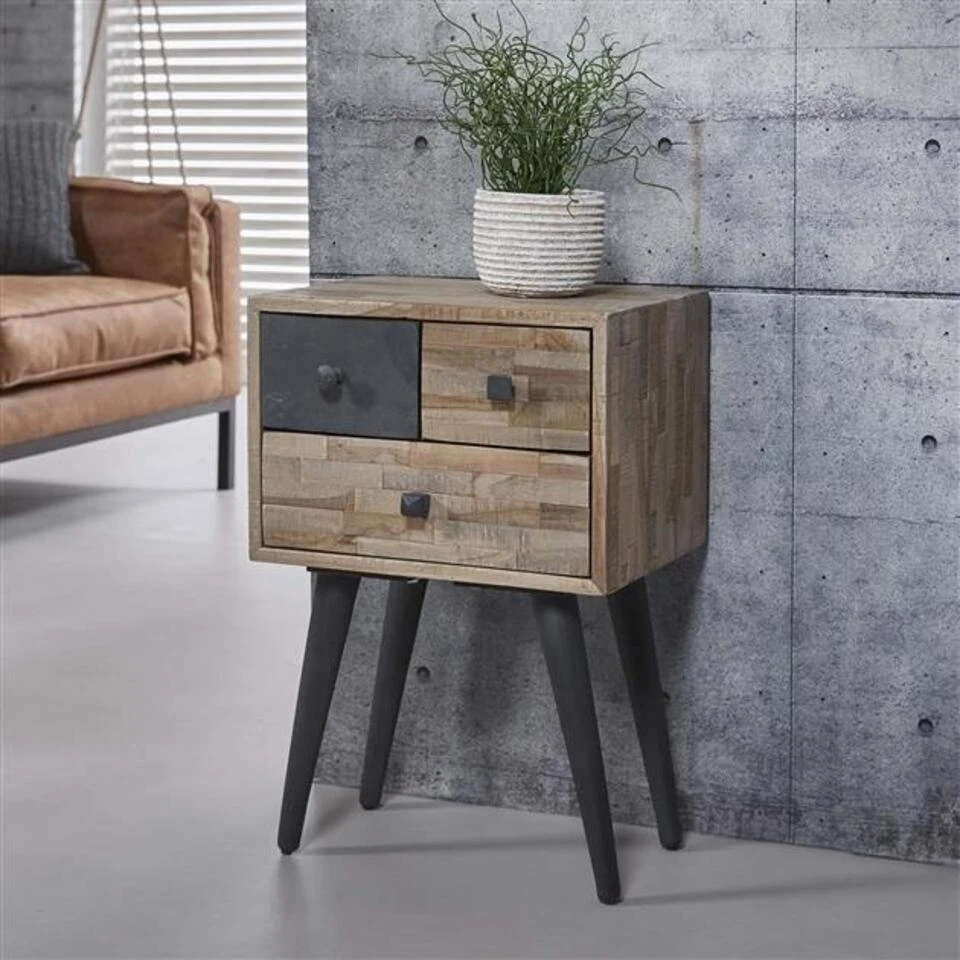 Het industriële kastje Cloë is gemaakt van verweerd teakhout dat gelegd is in strookjes. Meubels van teak staan er om bekend dat ze na vijfentwintig jaar nog in goede staat verkeren. Het is een duurzame houtsoort die vrij weinig nawerkt. Naast het teakhout is er gebruik gemaakt van één leistenen front. Dit maakt de Cloë een verrassende verschijning! Omdat elk nachtkastje uniek is, kunnen er onregelmatigheden in vorm en kleur voorkomen.