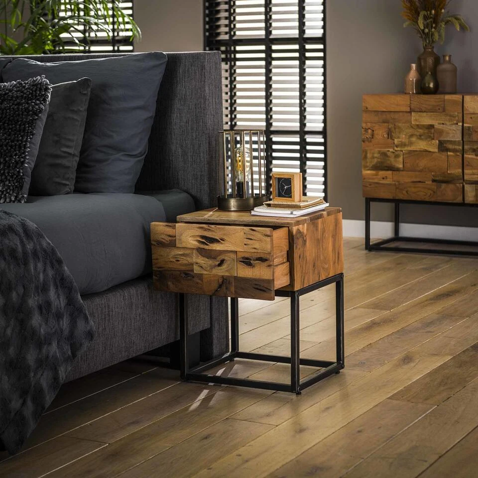Voer de industriële stijl door in de slaapkamer met nachtkastje Mill! Industrieel nachtkastje Mill is uitgevoerd in gezandstraald acaciahout in combinatie met een metalen frame. Dit nachtkastje is voorzien van één lade en is ingelegd met verschillende stroken hout, wat het meubel een stoer en eigentijds karakter geeft.