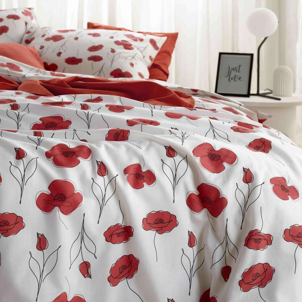 Moodit Dekbedovertrek, Odil Papaver. Dit mooie eenpersoons dekbedovertrek uit de Odil collectie van Moodit heeft een leuk dessin van rode bloemen. Het overtrek met klaproos print past geweldig in een moderne woonstijl. De print is aan beide zijden bedrukt en komt ook terug in de kussensloop. Gemaakt van 100% katoen, wat bijdraagt aan een comfortabele nachtrust door de ademende en sterk vocht-absorberende eigenschappen. De Odil dekbedden zijn prima te combineren met de uni-color collectie Basil van Moodit. Mix and match en zet de sfeer naar jouw hand, altijd en overal!