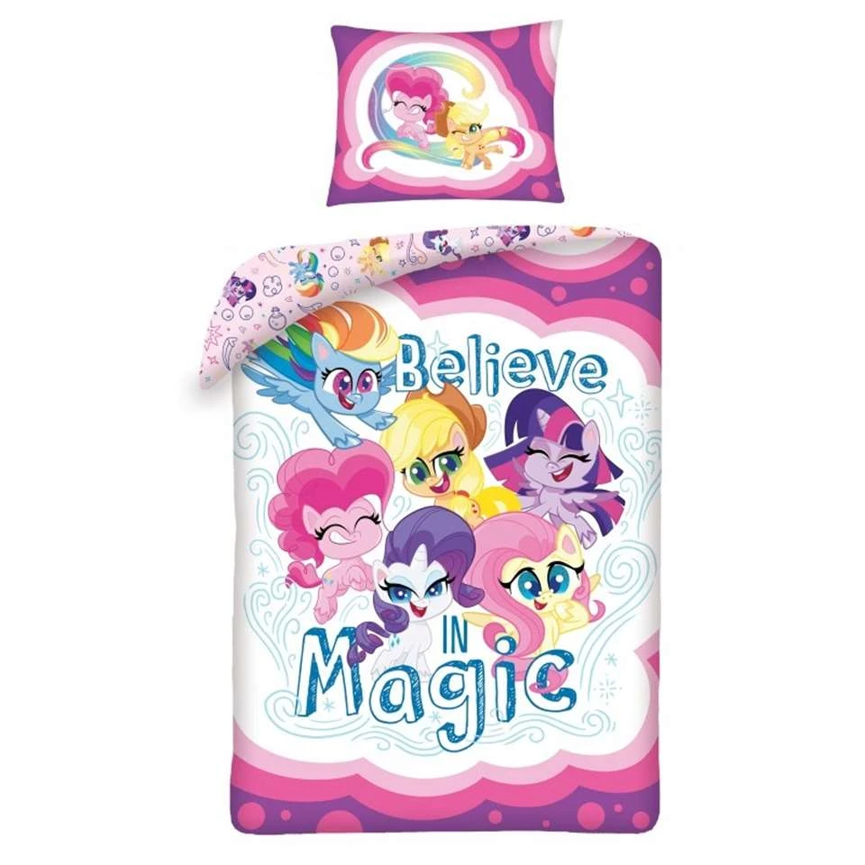 My Little Pony Dekbedovertrek, Believe in Magic. Deze vrolijke figuren van My Little Pony fleuren de kinderkamer helemaal op. Het dekbedovertrek heeft een leuk contrasterend effect op de achterzijde, wat een grappig effect geeft. Gemaakt van katoen, met een extra grote kussensloop en geleverd in een leuke tas. Een geweldig cadeau voor elke My Little Pony fan!