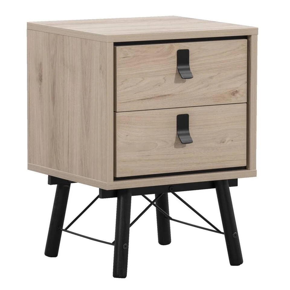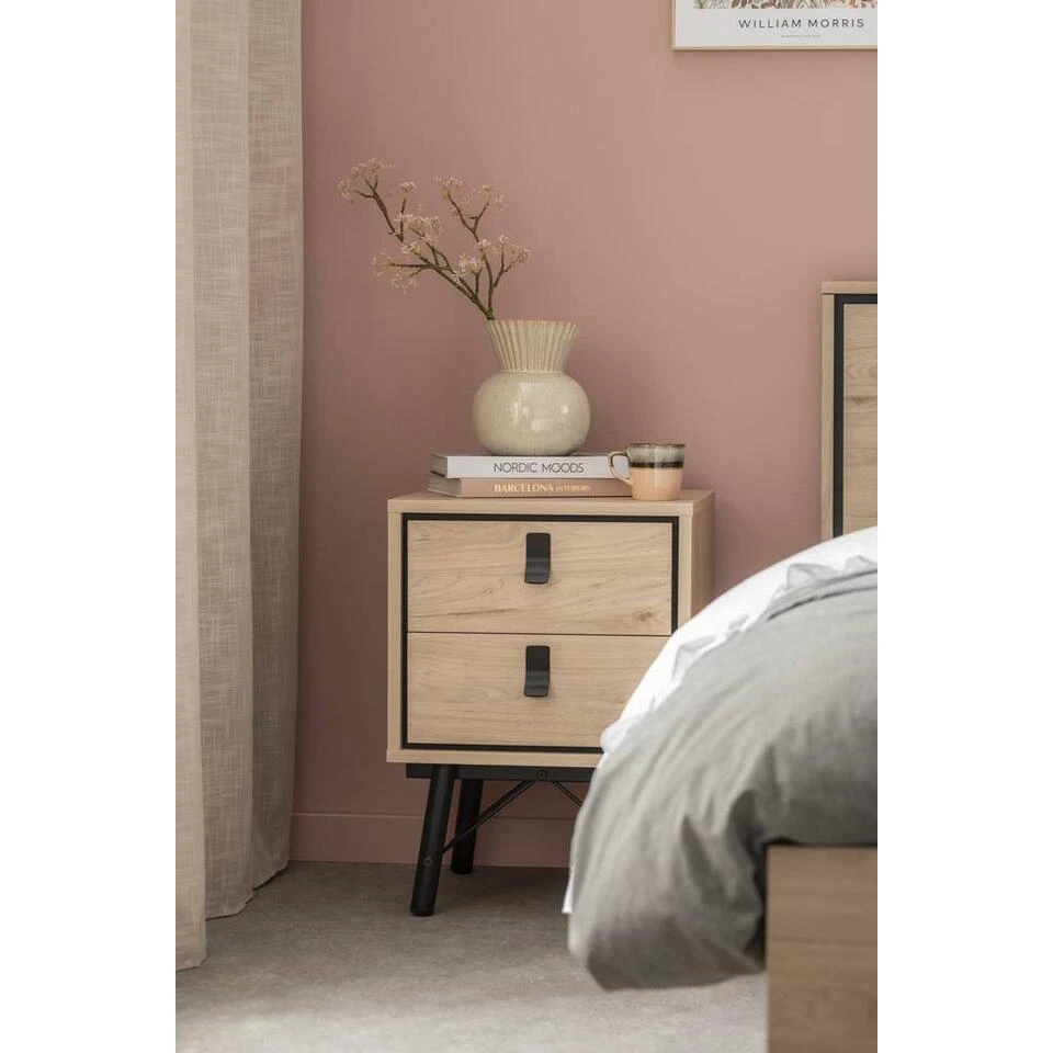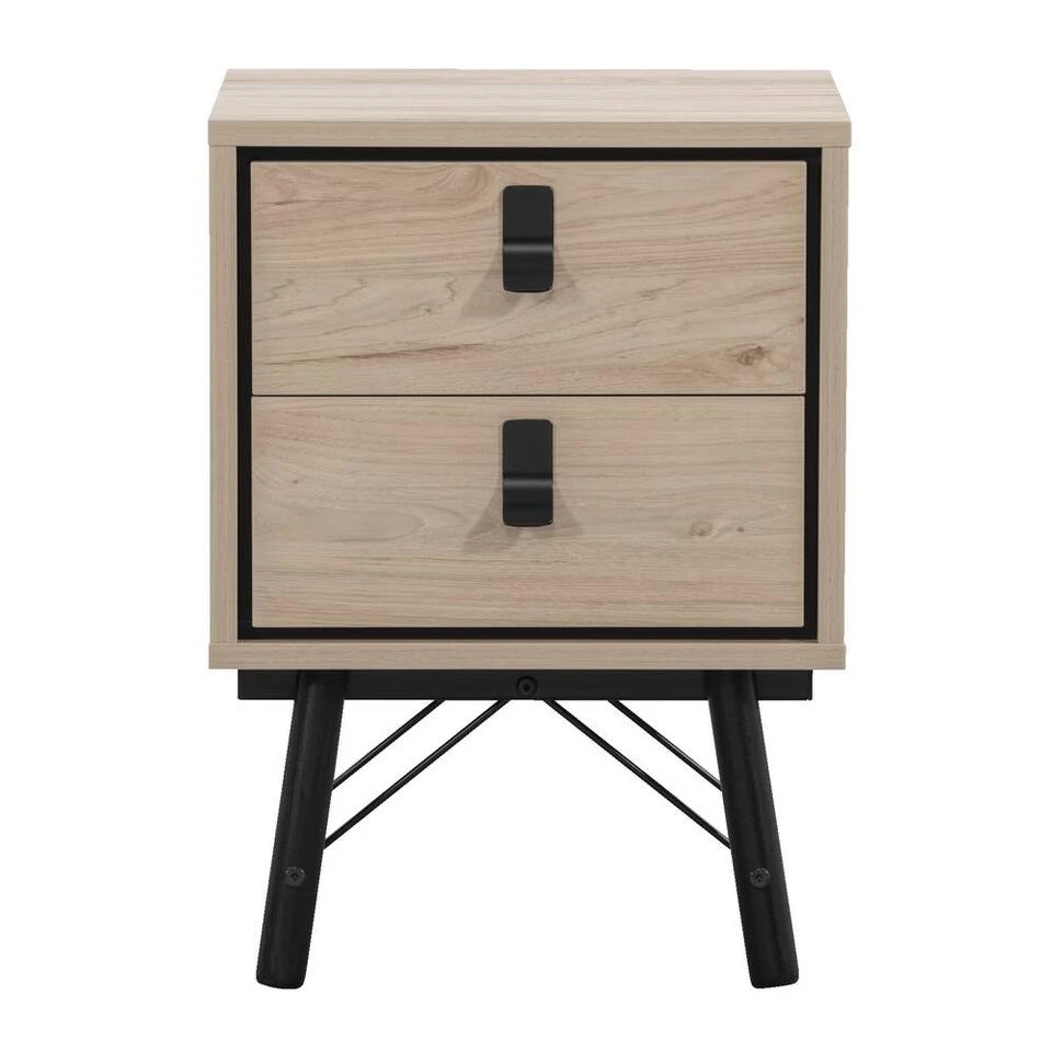 Nachtkastje Kansas heeft een mooie eiken kleur met zwarte details. Het kastje is gemaakt van spaanplaat en heeft 2 lades waardoor je zowel op als in het kastje genoeg ruimte hebt om spulletjes te plaatsen of op te bergen. Het kastje past door zìjn strakke design ideaal in verschillende interieurstijlen en heeft een totale afmeting van 44x40x60 cm (bxdxh).