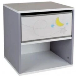 Space nachtkastje, Maan. Fantastisch cadeau voor de kleine astronaut. Het kastje is versierd met een maan en een aantal sterren. Dit praktische nachtkastje is voorzien van 1 lade en 1 open compartiment. In deze collectie is ook een peuter bed te verkrijgen (apart bestellen). Enige assemblage vereist.