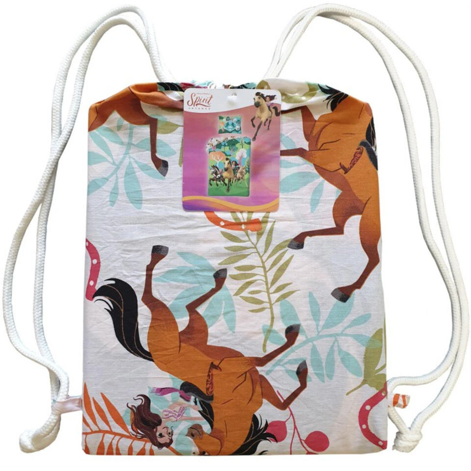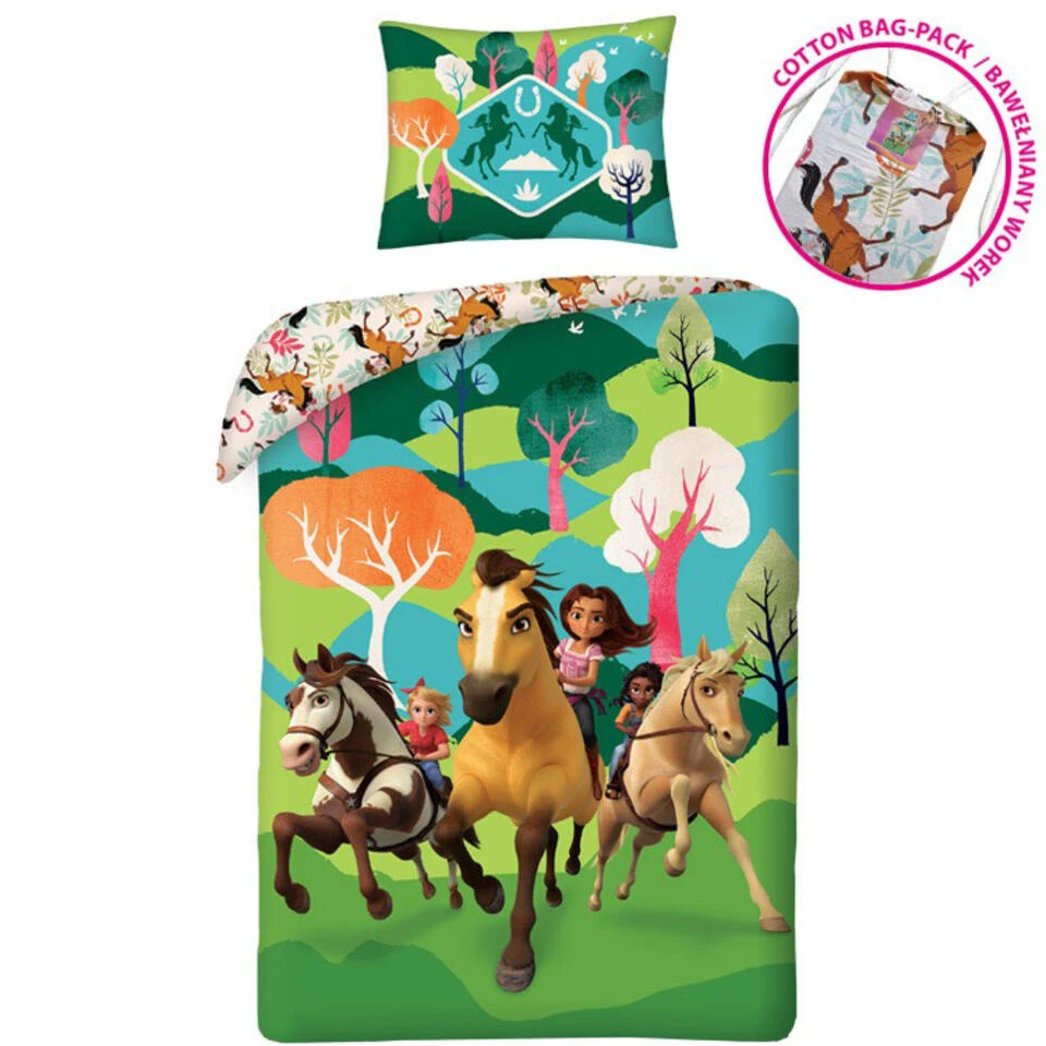 Spirit Dekbedovertrek, Fortuna. Een kleurrijk katoenen dekbedovertrek van de bekende paardenserie Spirit. Lucky, Pru en Abigail zijn beste vriendinnen en hun paarden zijn dat ook! Het vrolijke overtrek is dubbelzijdig geprint en wordt geleverd met een extra groot kussensloop! Kortom; een geweldige cadeau voor een verjaardag of de feestdagen voor elke Spirit-fan.