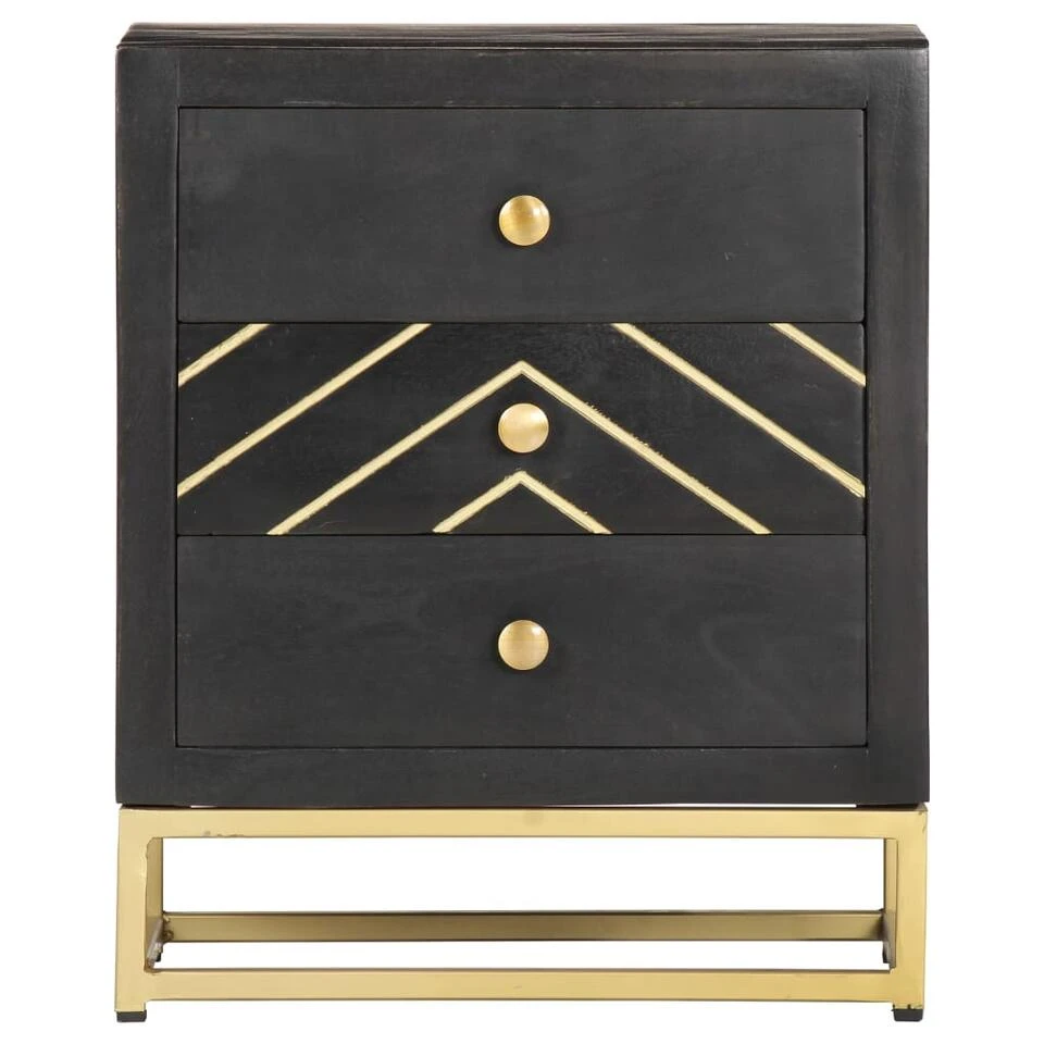 Ons nachtkastje heeft een zwarte en goudkleurige afwerking en is een decoratieve aanvulling op je slaapkamer.