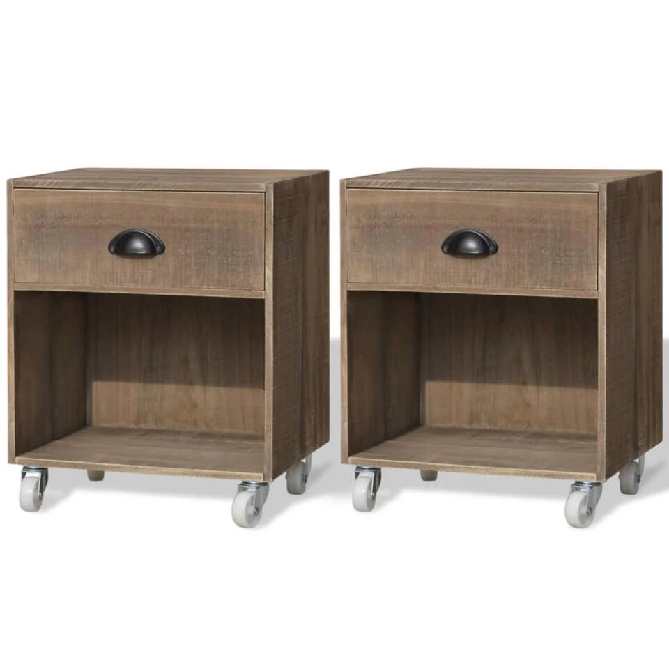 Deze houten set, bestaande uit 2 nachtkastjes, is zowel een praktische als een decoratieve toevoeging aan je slaapkamer. Hij kan eveneens gebruikt worden als een telefoontafel, een ladekast, een nachtkastje of een bijzettafeltje.